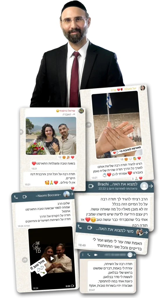 ביחד עם הרקע התורני שלי כרב, והרקע שלי כמטפל, כמרצה וכמדריך – מאפשרים לי להעניק לך ידע פרקטי ומעשי שיעזור לך להרגיש ביטחון בעצמך ובדרך שלך ולמצוא את האדם המדוייק ביותר עבורך!